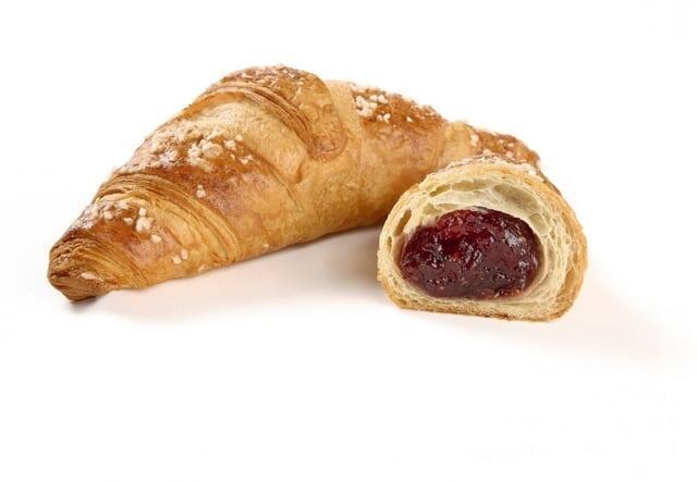 - Королевский круассан с клубникой. Это шедевр выпечки с воздушным тестом и клубничным джемом, в который добавлены настоящие кусочки ягод. Такой круассан дарит невероятное удовольствие.