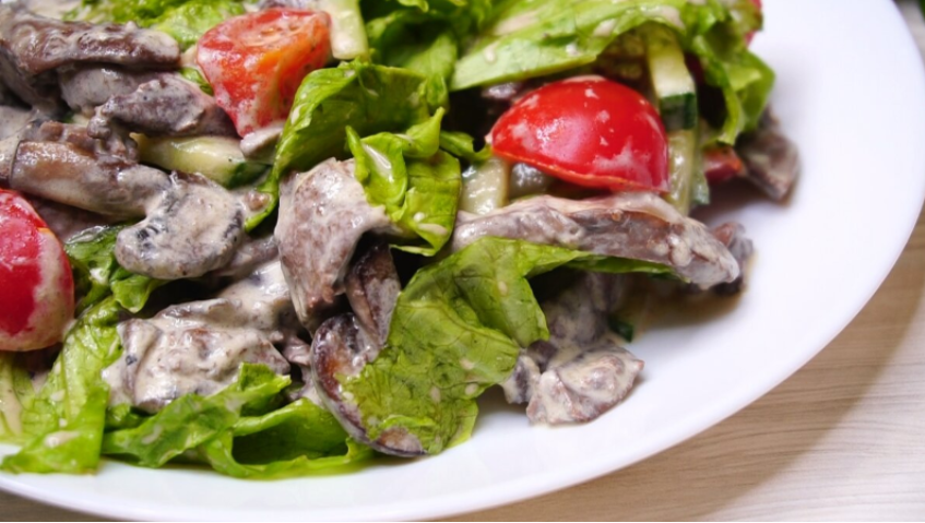 Этот теплый салат не оставит равнодушными ни взрослых, ни детей. Он сочетает в себе ароматные шампиньоны и нежную куриную печень, создавая уникальное гастрономическое впечатление. И даже те, кто не любит печень, оценят этот оригинальный подход к здоровому ужину.