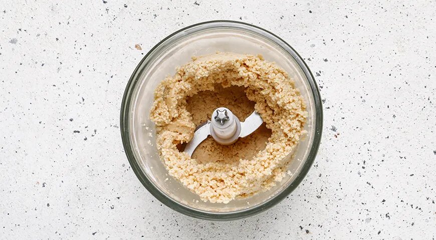 Для начала требуется подготовить арахис. Он должен провести 5 минут в нагретой до 180°C духовке. После этого следует очистить его от шелухи, потерев между ладонями, и измельчить в блендере до состояния мелкой крошки.