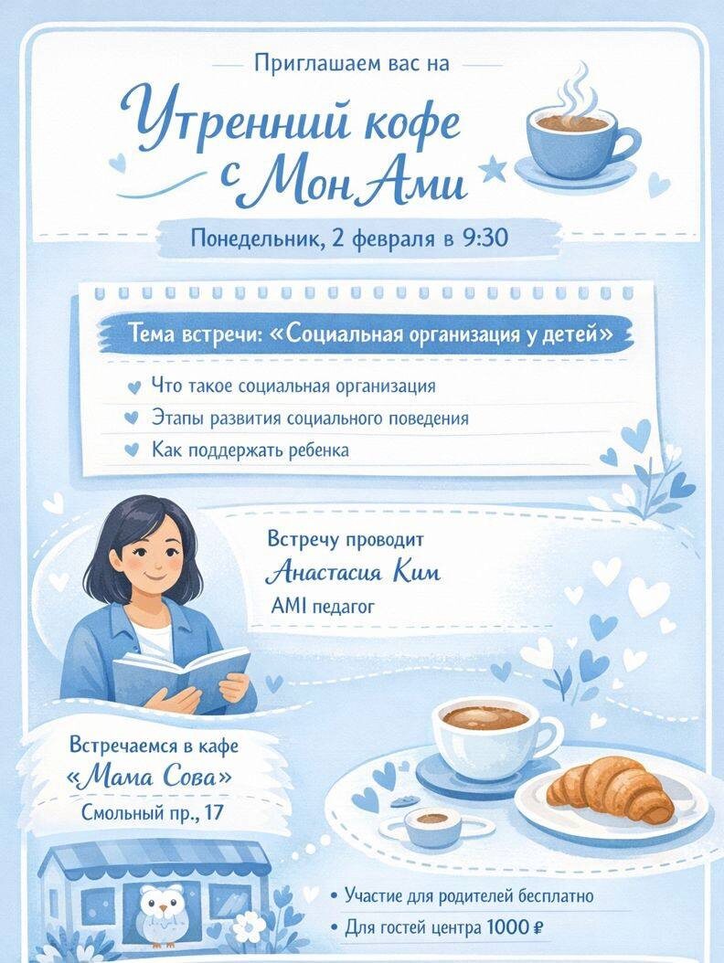 Приглашаем всех желающих на увлекательную встречу «Утренний кофе с Мон Ами», которая пройдет в понедельник, 2 февраля, в 9:30. Это отличная возможность не только выпить кофе, но и обсудить важные вопросы, касающиеся социального развития детей.