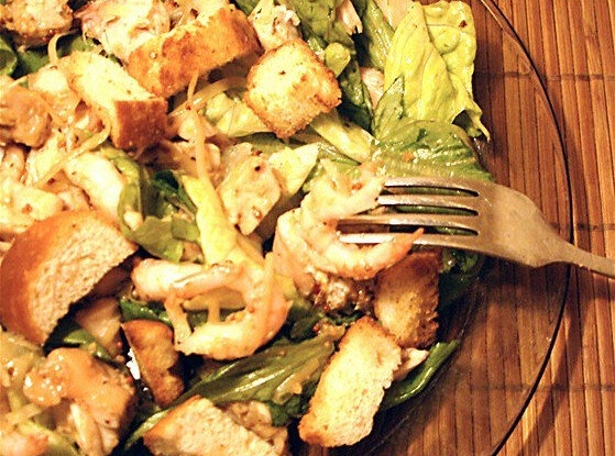 Листья салата Ромен разобрать на отдельные части, тщательно вымыть и обсушить. Половину листьев выложить в салатницу, сбрызнуть приготовленным соусом, далее добавить нарезанное кусочками куриное филе и креветки. Полить оставшимся соусом, посыпать гренками и тертым пармезаном, аккуратно перемешать, стараясь не повредить листья, сообщает Еда.ру.
