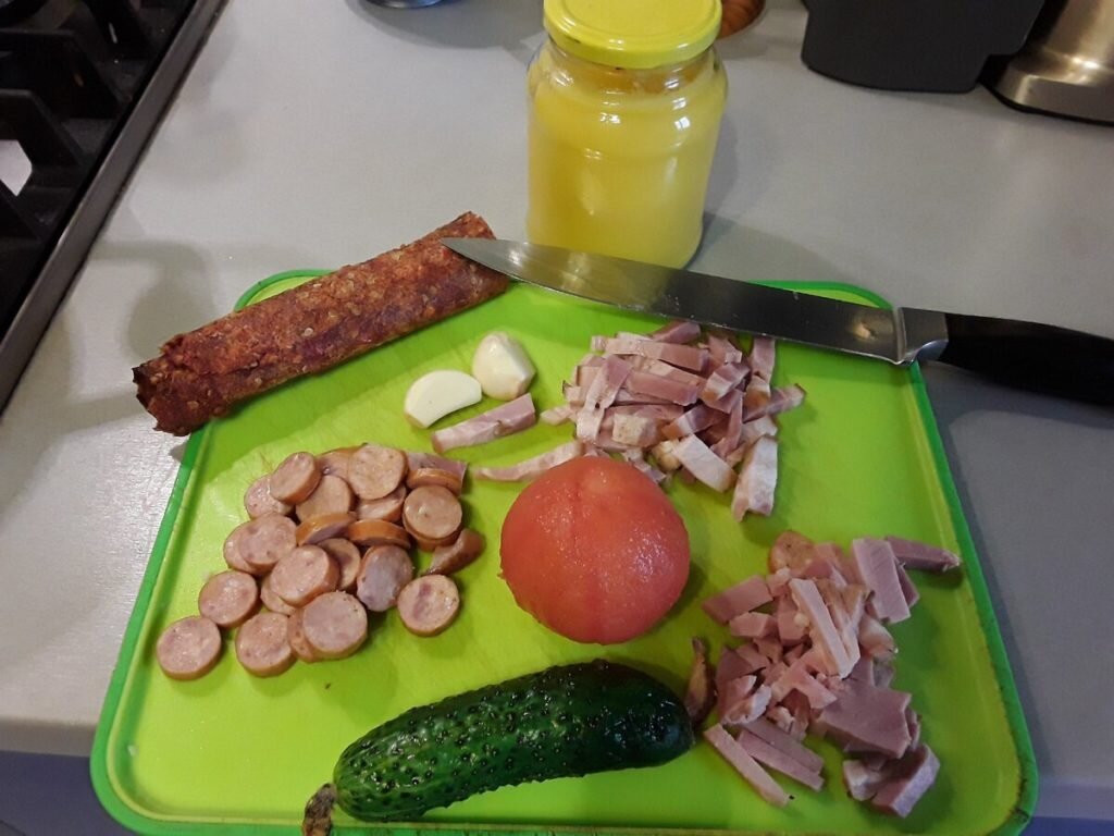 Ассортимент для солянки был представлен копченой грудинкой, ароматной свининой, варено-копченым окороком, тонкими колбасками с сыром, сыровяленой курицей и копчеными рёбрами. Все эти вкусности были куплены на местном рынке.