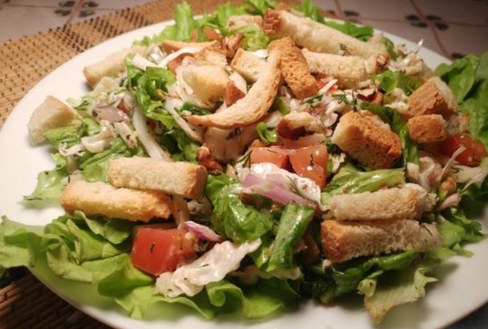 Подают салат на целых листьях салата, а перед подачей посыпают сверху хрустящими сухариками. Такой салат не только радует глаз, но и приносит незабываемое удовольствие!