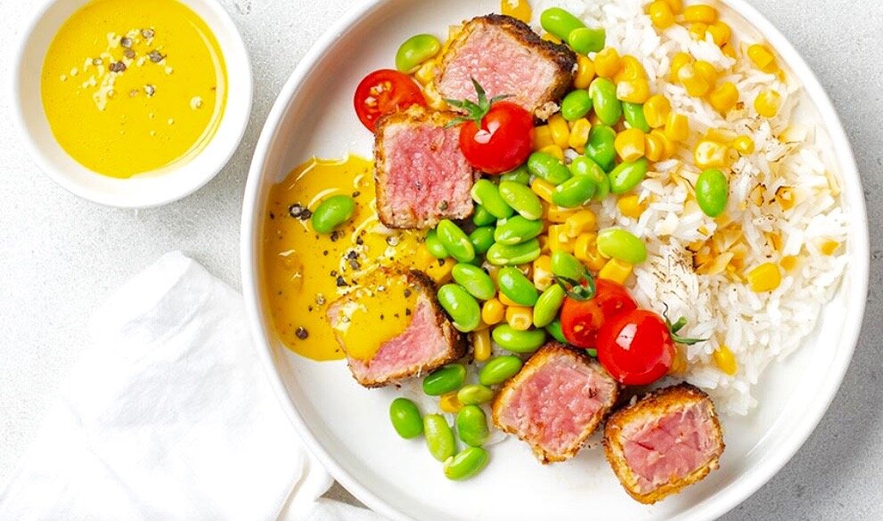 - Тунец запеченный под соусом манго-майо: стейки тунца сохраняют сочность и насыщенный вкус благодаря особому маринаду и запеканию с хрустящей корочкой.