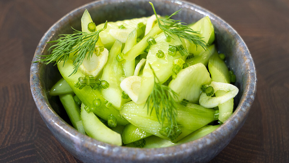 Для начала, освободите огурцы от кожуры с помощью овощечистки, после чего нарежьте их вдоль на четыре части и удалите семена. Затем, нарежьте стебель сельдерея мелко, а огурцы — на небольшие порционные кусочки. После этого поместите все в герметичный пластиковый контейнер.