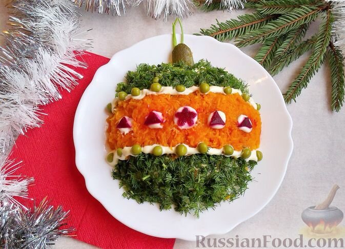 Салат "Оливье", который всегда присутствует на новогоднем столе, можно оформить в виде новогоднего шара для создания веселой атмосферы. Сочетание куриного филе, яиц, картофеля и зелени укропа в таком виде порадует всех присутствующих.