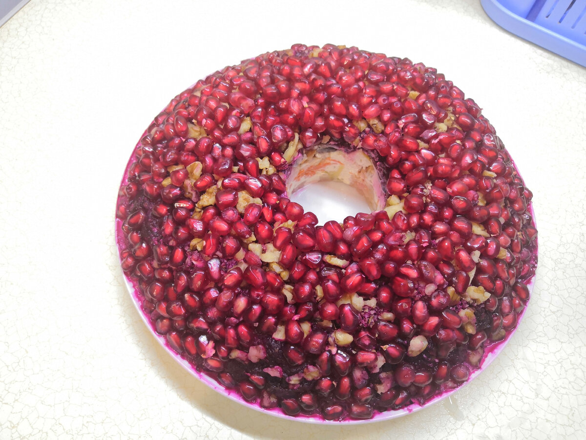 На свекле расположить измельченные орехи и семена граната. Зерна слегка вдавить в верхний слой для лучшего оформления. Убрать салат в холодильник на пару часов для застывания.