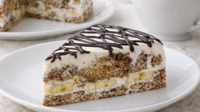 - Застелите форму пленкой для удобства удаления торта. Быстро обмакните пряники в крем и выложите их в форму, чередуя с бананами до завершения ингредиентов. Пустоты можно заполнить мелкими кусочками пряников.