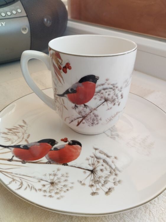 Вдохновленная кружкой со снегирями, хозяйка решила порадовать себя новыми чашками и блюдцами. А когда она случайно наткнулась на посудную лавку, где увидела еще больше изделий с этими симпатичными птицами, решение было принято. Несмотря на внутренние дебаты о ненужных тарелках, у нее появилась настоящая возможность добавить в коллекцию интересные находки.