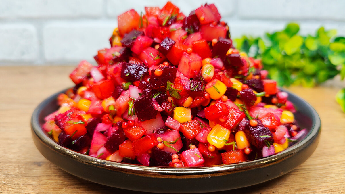 Ингредиенты, составляющие салат, схожи с теми, что используются для винегрета: отварные овощи, которые всегда под рукой. Однако несколько ключевых деталей делают его вкус неповторимым: сладкая кукуруза, ароматный укроп и заправка с зернистой горчицей добавляют пикантности и разнообразия. Такой салат идеально подходит для семейного ужина или незапланированного визита гостей.
