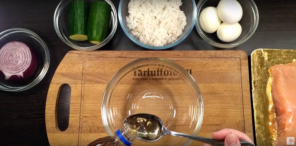 Далее перейдем к самой насыщенной части. В большую миску нарезаются 4 крупных яйца и свежие огурцы, оба в небольшие кубики. К ним добавляется 200 граммов отварного риса.