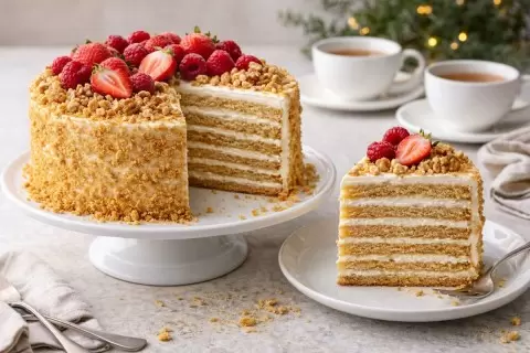 Сливочно-медовый торт — это не только десерт, это настоящее кулинарное волшебство, которое придаст вашим праздникам особый уют и радость. Собравшись с близкими, не упустите возможность порадовать их этим сладким шедевром, который подойдет к любому напитку и порадует вкусом и ароматом.