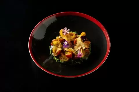 - Севиче из кабачка с лаймовым соком и кокосовой водой, дополненное ферментированным чили;