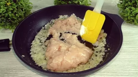 Начинаем с приготовления начинки. В сковороду необходимо налить растительное масло и добавить небольшую часть сливочного (около 20 г). Обжарить лук до мягкости в течение 3 минут, затем добавить фарш, готовить на среднем огне до испарения жидкости.