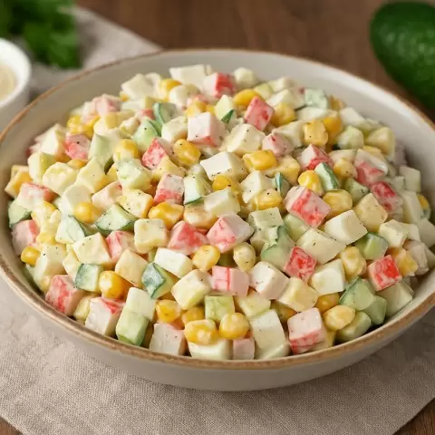 Добавление консервированной кукурузы сделает вкус более ярким и придаст легкую сладость. Основная заправка состоит из оливкового майонеза, который аккуратно перемешивается с остальными компонентами, добавляя соль по вкусу. После этого рекомендуется оставить салат в холодильнике на 15-20 минут, чтобы все вкусы сбалансировались и «подружились» друг с другом.