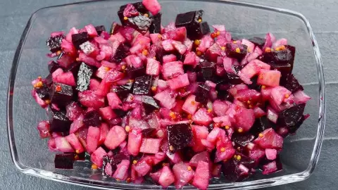 Представляем вам потрясающий рецепт свекольного салата, который удивит ваших гостей и станет настоящей звездой любого стола. Это блюдо сочетает в себе удивительную простоту ингредиентов и восхитительный вкус!
