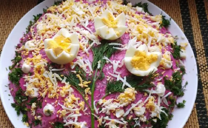 Процесс приготовления начинается с подготовки лука. Его следует мелко нарезать и добавить в миску с солью, сахаром, водой и уксусом. В то же время курицу, яйца, картофель и свеклу отварить по отдельности. Курицу нужно нарезать маленькими кусочками, картофель натереть на терке, а яйца сделать тем же образом.