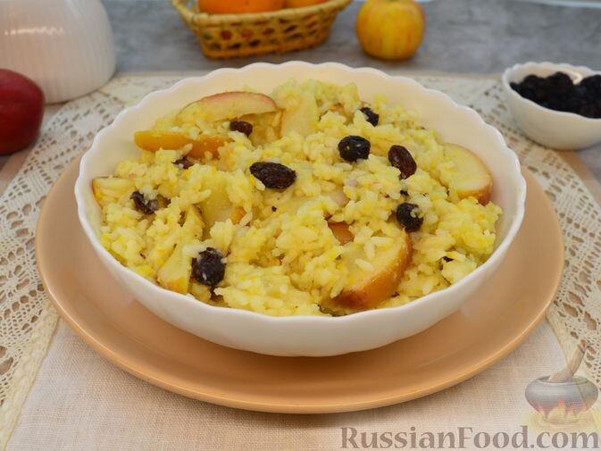 - Рисовая каша с яблоками и изюмом. Это блюдо преображают апельсиновая цедра, корица и ароматные яблоки, создавая невероятный вкус и аромат, который поднимет настроение на весь день.