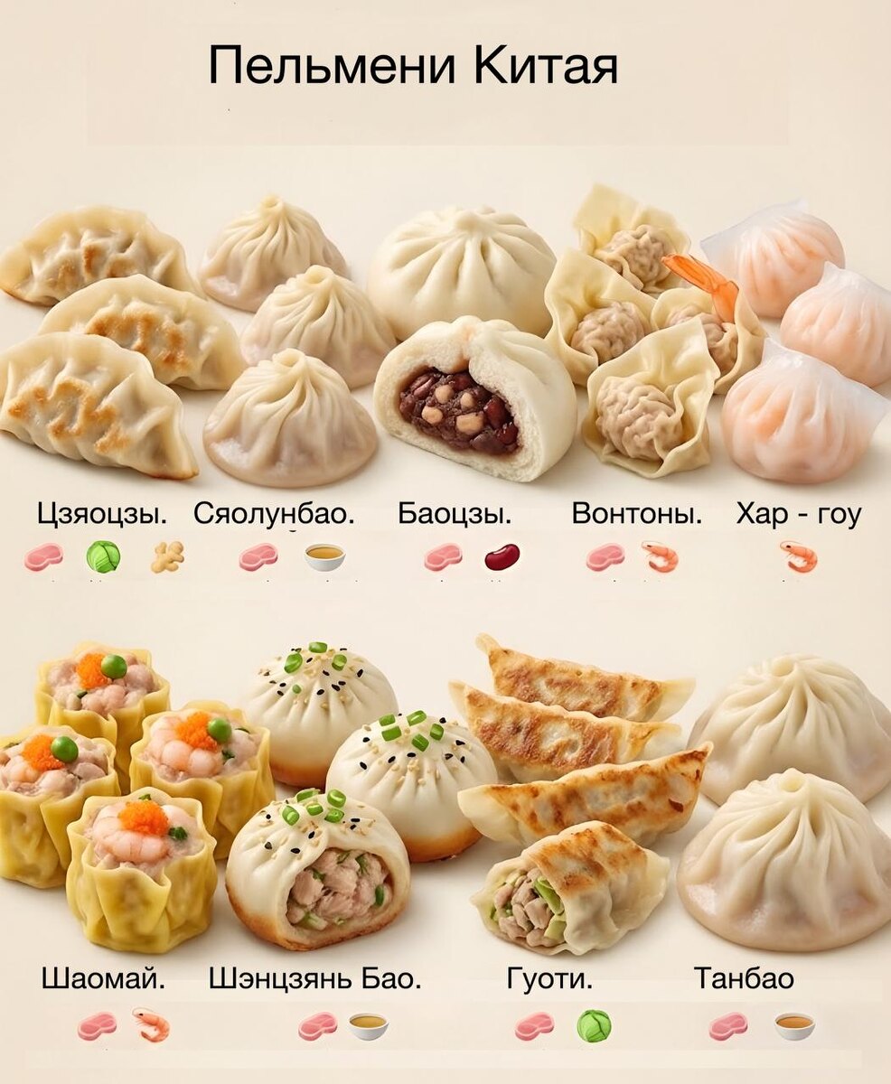 Китайские пельмени могут быть приготовлены разными способами — от варки и жарки до пару. Наполнения варьируются в зависимости от региона и сезона. Вот несколько популярных вариантов: