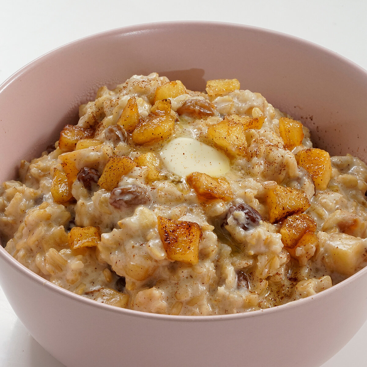 Для этого рецепта понадобятся: 150 граммов овсяных хлопьев, пол-литра молока, 20 граммов сливочного масла, одно яблоко среднего размера, 30 граммов изюма, 30 граммов сахара и молотая корица на вкус. Рекомендуется использовать настоящие геркулесовые хлопья, которые требуют около 15 минут варки: они идеально подходят для создания разваренной, томленой каши.