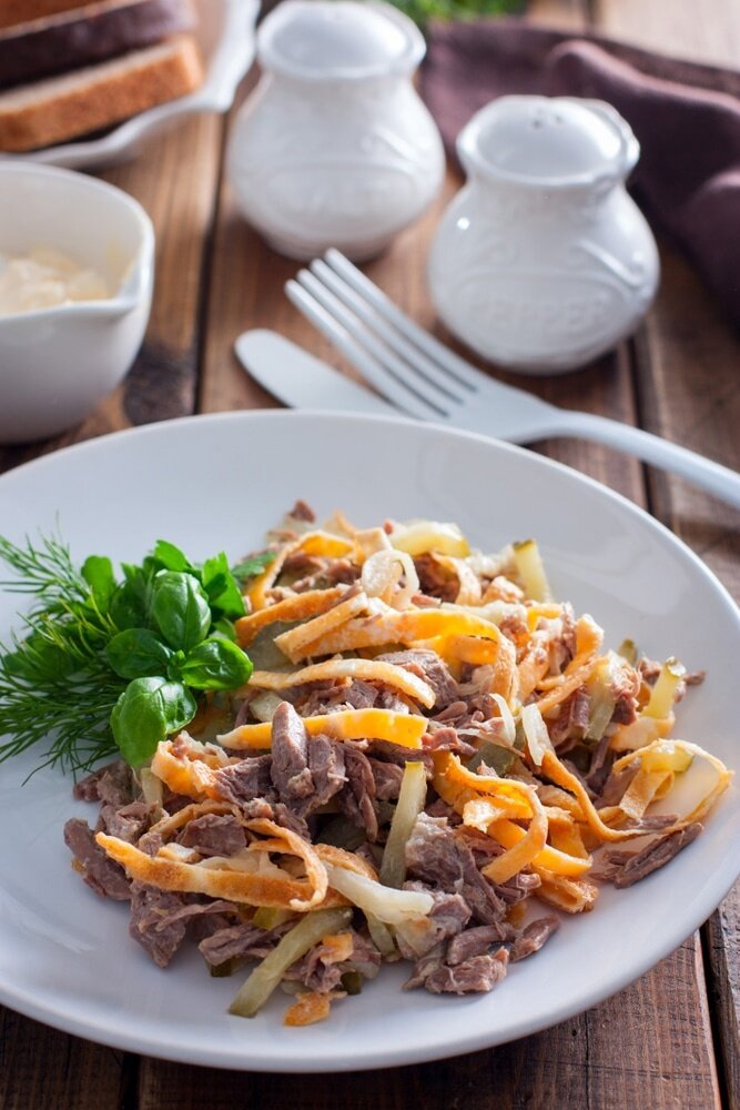 Солёные огурцы, предпочтительно корнишоны, нарезать тонкими полосками и добавить в салат. Репчатый лук очистить, нарезать и обжарить на растительном масле до прозрачности. После остывания лук также добавляют в общую массу.