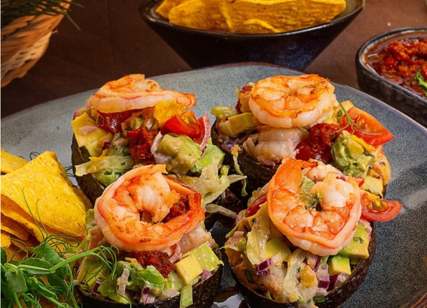 Шаг 6: В «чашечки» из авокадо добавьте немного сальсы, измельчённые чипсы и заполните смесью салата из авокадо и креветок.