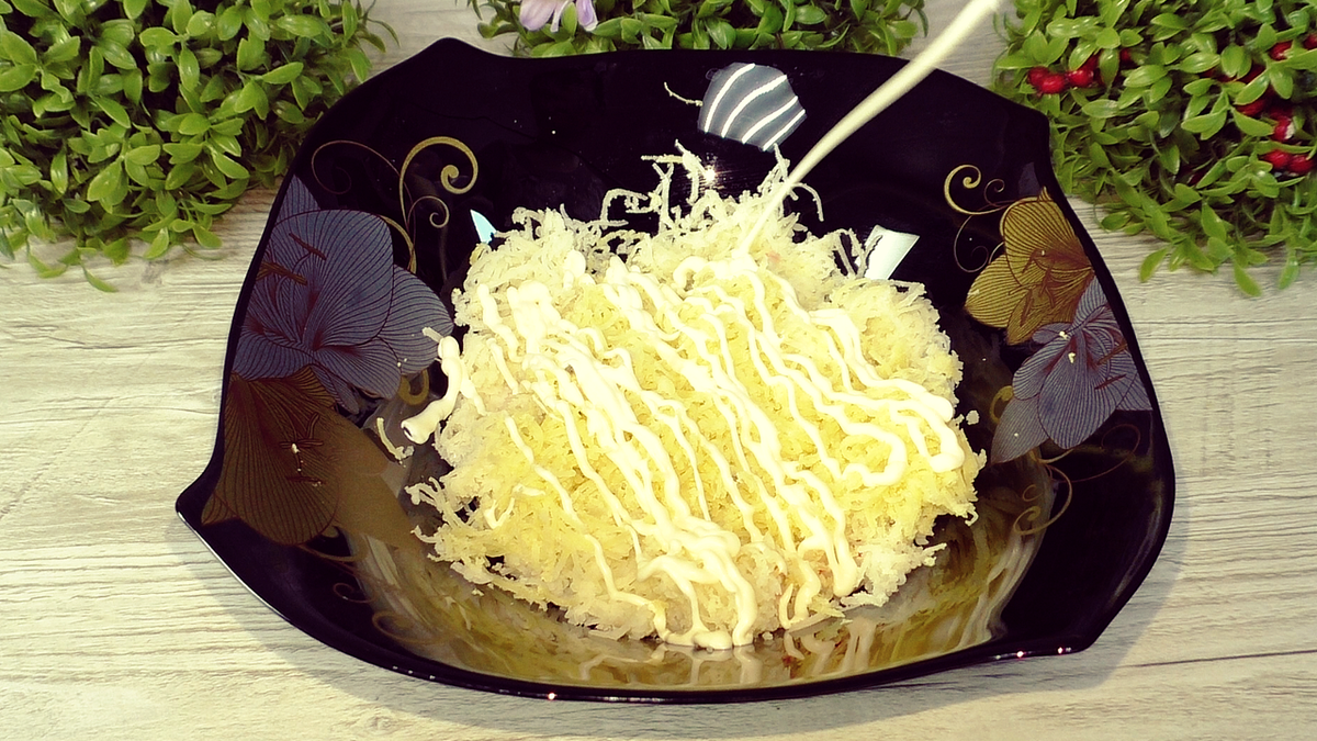 4. Завершите всё свёклой на мелкой тёрке и вновь добавьте майонез наверх. Дайте салату немного постоять перед подачей на стол для лучшего пропитывания.