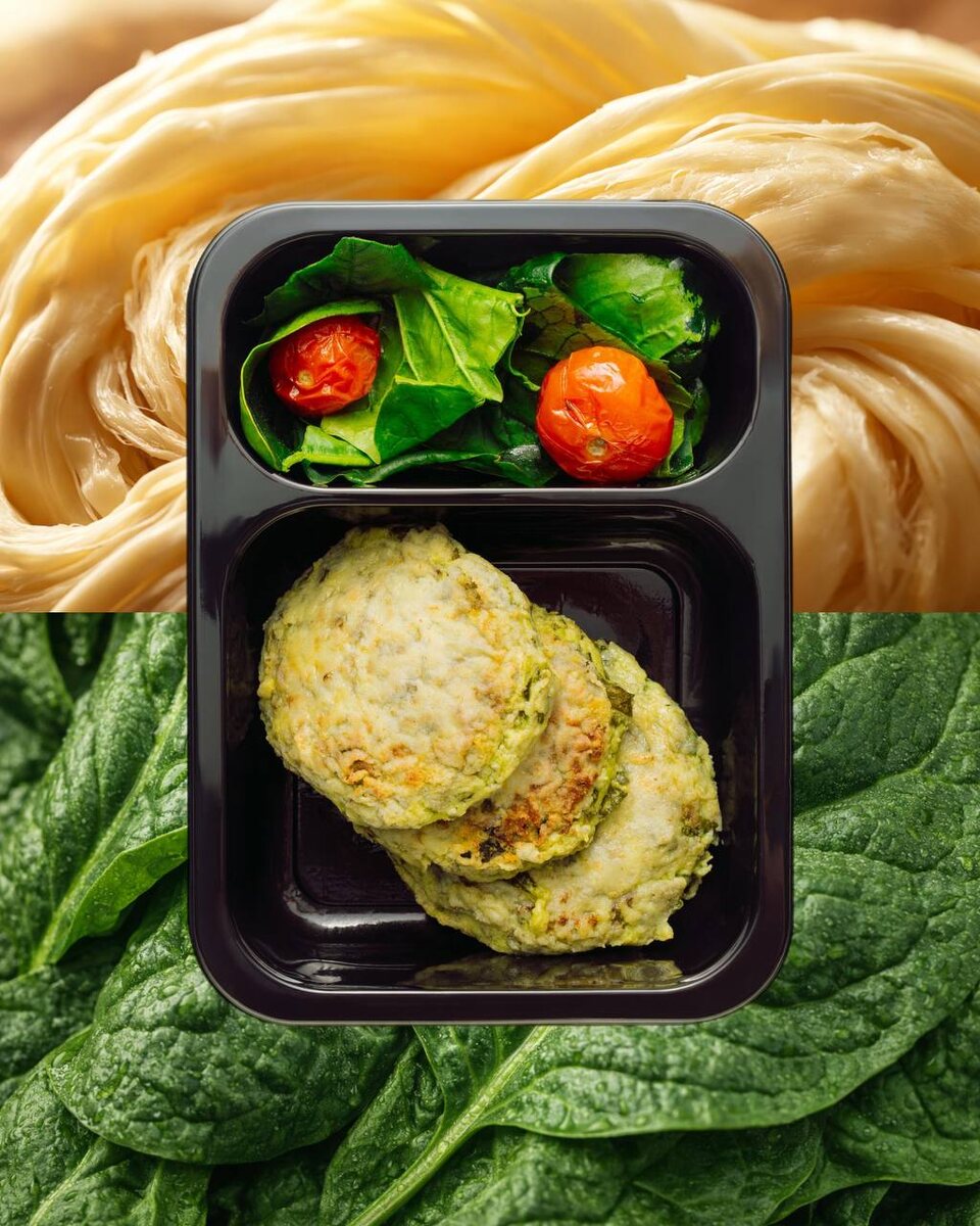 Первый представитель — сырники с тёплым сулугуни и свежим молодым шпинатом. Эти сырники восхищают своим сливочно-солёным вкусом, где мягкость тягучего сыра идеально контрастирует с яркой зеленью. Это настоящая находка для тех, кто предпочитает savoury варианты!
