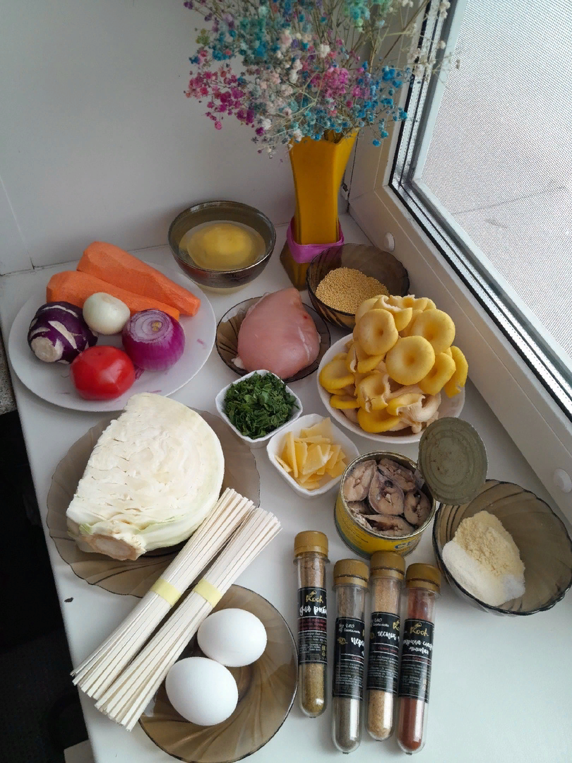 - Яйца, грибами (например, вешенками) и лапша (удон или спагетти);