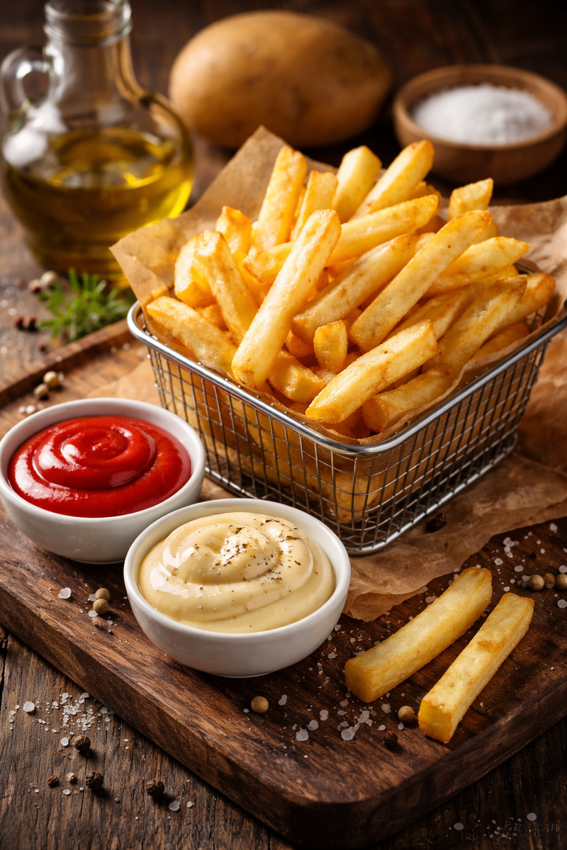 Процесс приготовления: очистите картофель, нарежьте, промойте и обсушите. Разогрейте масло до 150 градусов и обжаривайте картошку 5 минут, пока она не станет мягкой. Дайте остыть и пожарьте еще раз при 180 градусах до золотистого цвета. После приготовления, не забудьте посолить.