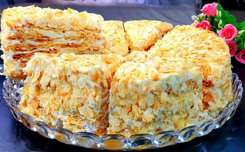 При сборке торта промазывайте коржи кремом, а обрезки теста переработайте в крошку для посыпки. После сборки дайте Наверное, лучше сохранять Наполеон в холодильнике минимум на 6-7 часов для интенсивного раскрытия вкусов.