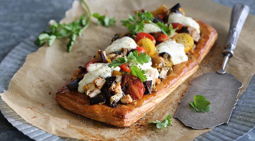 Разогрейте духовку до 200°C и подготовьте 2 противня, застелив их бумагой для выпечки.На одном из противней сформируйте прямоугольник из теста размером 40х15 см. Лучше всего его не раскатывать, а аккуратно подрезать и склеить. Сделайте надрезы по краям, отступив 3 см, и проколите центральную часть вилкой. Дайте тесту немного постоять, затем смажьте взбитым желтком со сливками и посыпьте щепоткой соли. Выпекайте в нижней части духовки примерно 20 минут до блестящей корочки.Тем временем нарежьте буженину кубиками размером 1,5 см. Баклажаны нарежьте вдоль пластами толщиной 2 см, смажьте маслом и посолите. Выложите овощи на второй противень. Сладкие перцы нарежьте на четвертинки и добавьте к баклажанам.Выпекайте овощи в верхней части духовки около 20 минут. За 5–7 минут до готовности добавьте к ним помидоры черри. Готовые овощи нарежьте кубиками и смешайте с бужениной, добавив немного масла, соли и перца.Заполните тесто начинкой, поверх которой распределите маскарпоне. Прогрейте в духовке ещё 10 минут. Пирог можно подавать горячим.