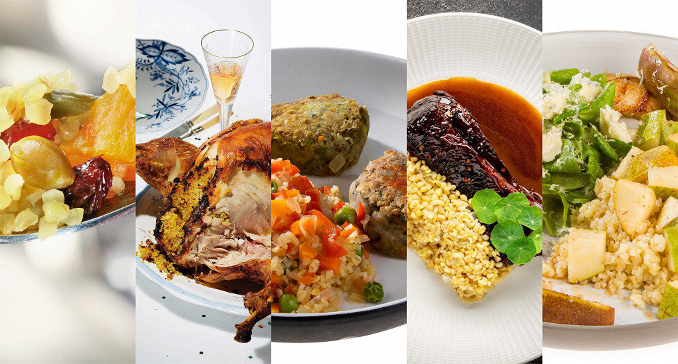 Печеная груша придаёт этому салату особую изысканность, превращаясь в нежное пюре. В комбинации с дробленым булгуром, она создает удивительно легкое и гармоничное блюдо. Рекомендуется выбирать грушу «Конференс», поскольку её плотная текстура идеально подходит для запекания и маринования.