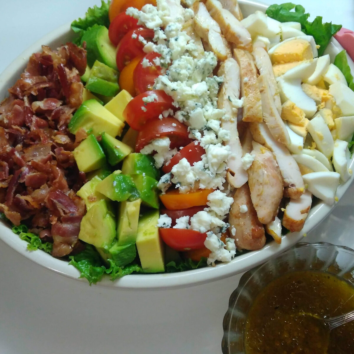 Для заправки смешайте оливковое масло, бальзамический уксус или лимонный сок, зернистую горчицу, добавьте соль и перец по вкусу. Взбейте до однородности и подавайте отдельно, чтобы каждый гость мог сам заправить свой салат по вкусу. Кобб-салат станет настоящей находкой на любом праздничном столе!