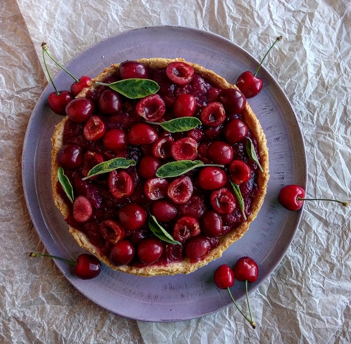 Когда все части готовы, собрать тарт, заполнив форму заварным кремом, сверху распределить начинку из черешни. Оставить в холодильнике на несколько часов или на ночь для наилучшего результата. Перед подачей украсить свежими ягодами и листиками шалфея!