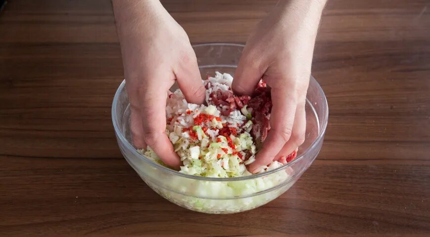 - Смешайте капустные листья с фаршем и рисом, приправьте.