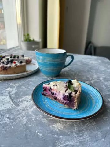 Затем выложите полученное тесто в форму диаметром 16 см, равномерно распределив по дну и стенкам. Переходите к начинке: смешайте оба вида творога, добавьте белки и кукурузный крахмал, тщательно перемешав до однородности. В завершение добавьте ягоды и аккуратно перемешайте.