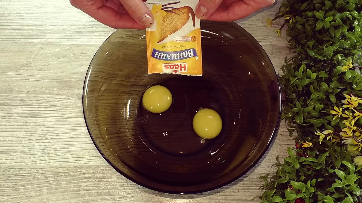 Для начала в глубокой миске соедините яйца, щепотку соли, ванилин и сахар. Тщательно перемешайте до получения однородной массы.