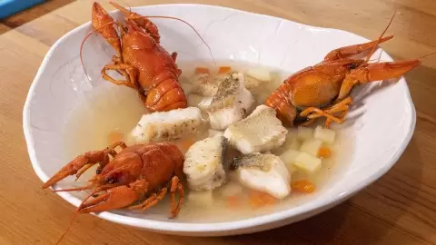Когда бульон будет готов, процедите его, добавьте в него картошку, морковь, лавровый лист и мелко нарезанный лук. Как только суп закипит, положите раков и через 10 минут выключите конфорку.