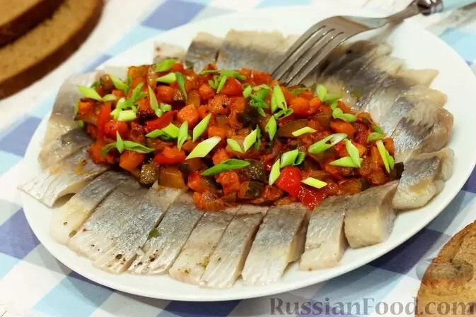 Солёная сельдь всегда актуальна на праздничном столе, а закуска с жареными овощами станет отличным дополнением. Просто приготовьте гарнир из болгарского перца, моркови и солёного огурца, и подайте его вместе с рыбой — это простое, но эффектное сочетание.