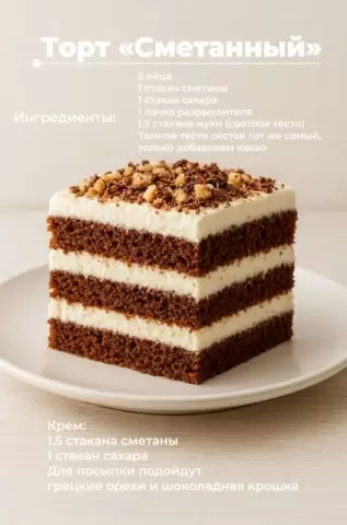 Этот легкий, тающий во рту сметанный торт станет украшением любого праздника, радуя не только глаз, но и вкусом. Гостям придётся по душе сочетание текстур, а вас будет переполнять чувство гордости за вкусный десерт, созданный с любовью.