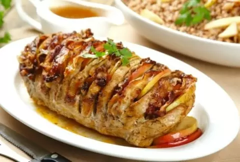 - Рулетики из свинины в абрикосовом соусе – сытное угощение для ужина, которое порадует гостей.